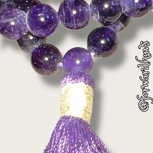 This Amethyst Mala necklace features 109 smooth, unknotted beads crafted from natural amethyst gemstones, celebrated for their calming energy and spiritual significance. The beads are strung in a continuous loop without knots between them, allowing for a fluid feel and easy handling during meditation or wear.