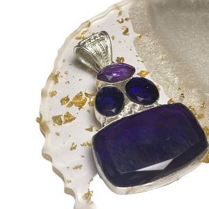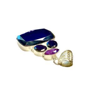 This can be dressed up or down. The larger stone measures 1” x 1.25”. It is opaque but lighter colors can be seen when light is applied. The two small round stones appear blue and the large stone appears blue in the right light. It is handmade by artisans; Sometimes the descriptions and actual jewelry are different. I purchased it as amethyst. The price has been reduced because of the mix-up.