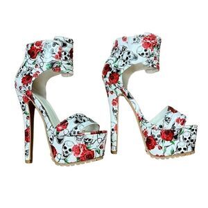 Sexy and wild. These shoes have it all. Red roses with skulls. The platform and tall heels scream Look At Me!