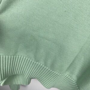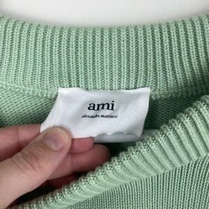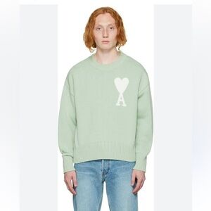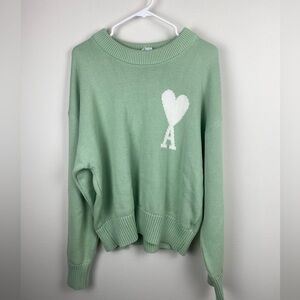 Stylish mint green sweater with a white heart and 'A' logo. Comfortable crew neck design. Perfect for casual wear.
