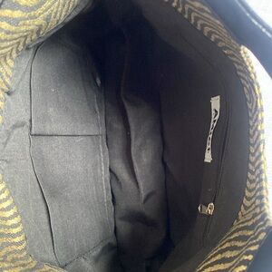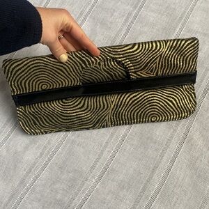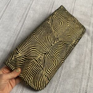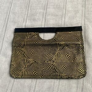 Amici Accessories retro clutch purse in gold metallic and black. Medium sized clutch. Folds and closes with patent leather handle. 80s aesthetic. One large interior compartment with one minor discoloration. Small interior zipper pocket. Clutch is made out of cloth and does have a few small silver imperfections but they are difficult to see in the cold pattern. Whimsigoth style. So much life left in this unique piece of vintage!