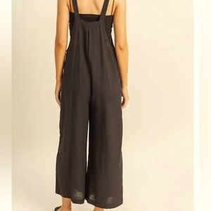 Stylish black jumpsuit with button straps. Perfectly placed front pleats with side pockets for convenience. This jumpsuit is ideal for layering over your favorite top.