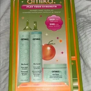Amika strength repair routine set with shampoo, conditioner, and treatment.