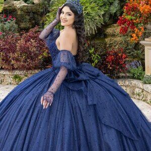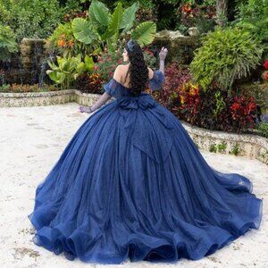 This majestic navy quinceañera dress is a show-stopping masterpiece, perfect for a princess moment. The gown features a shimmering, off-the-shoulder sweetheart neckline, complemented by elegant sheer sleeves that add a touch of drama and grace. The voluminous ball gown skirt, crafted from layers of glittering tulle, flows outward in a cascade of royal blue brilliance, capturing the light with every movement. A matching tiara and intricate bodice detailing elevate the look, making it ideal for a grand celebration. Set against a lush garden backdrop, this gown is a true fairytale come to life.