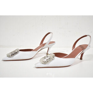 Amina Muaddi Camelia Sling 60 White Leather Crystal Slingback Low Heel Pump 39