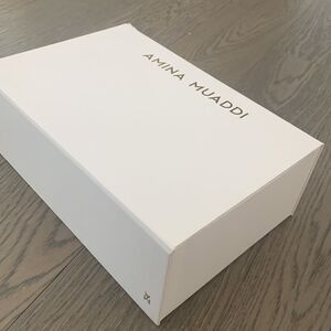 This empty Amina Muaddi shoe box is great for gift-giving or storage.