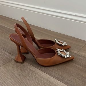 Nude/tan Amina Muaddi slingbacks with signature crystal in front. Worn twice. Includes box and dust bag. Damaged slightly on heels as shown in last picture.