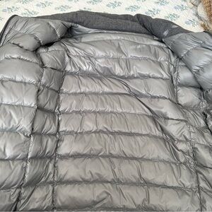 Stylish black puffer coat with gray lining. Perfect for cold weather.