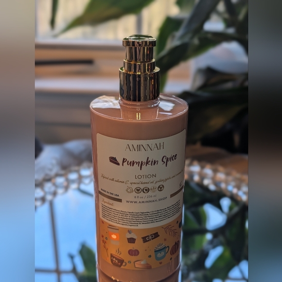 Experience the rich scent of pumpkin spice with Aminnah's cream-colored moisturizer. Perfect for hydrating and revitalizing your skin.