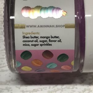 Shea butter, mango butter, coconut oil, mica, sugar, flavor oil, sugar sprinkles.
