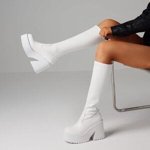 Aminugal Womens White Synthetic Chunky Block High Heel Knee High Platform Boots
