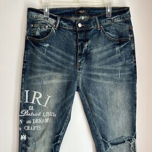 Stylish dark blue skinny jeans by AMIRI. Features distressed accents and unique print. Ideal for a modern casual look.