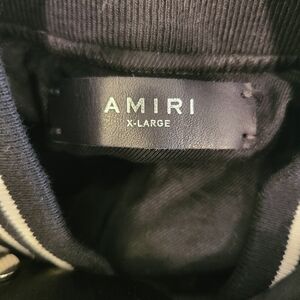 Amiri Black & Gray Satin Bomber Jacket. It’s in great preowned condition, there is a spot on the right shoulder and there is a little color transfer to the white on the hem.
