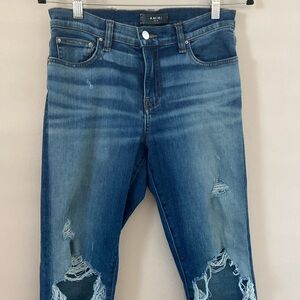 The jeans are medium-wash denim with multiple rips and frayed holes, particularly on both knees and thighs, giving them a worn and rugged look. There is a zipper detail at the bottom of both pant legs, adding a stylish touch. The jeans have a classic five-pocket design, with two front pockets and a small coin pocket visible. The waistband has belt loops and a button closure.