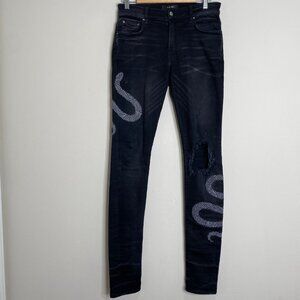 Amiri Glitter Snake Patch Broken Skinny Jeans Distressed Sz 30 FLAW