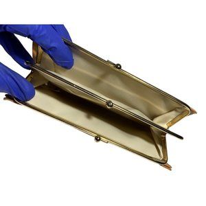 Condition: overall very good condition; not used; just stored away; metal clasp has some light scuffs, no marks on exterior; minor minor mark on inside of closure (see all photos).
