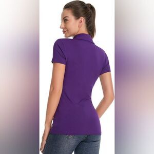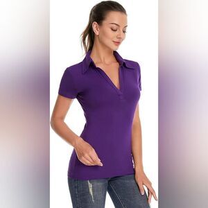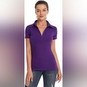 AmélieBoutik Women Collared V Neck Short Sleeve Polo Shirt Purple S