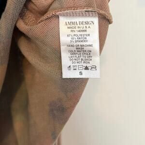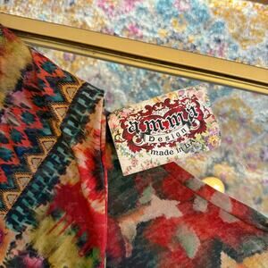 This Amma Design tunic features an expressive watercolor floral and geometric motif in vibrant jewel tones — fiery red, amber, indigo, and emerald — on a semi-sheer lightweight stretch knit. Made in Los Angeles, it’s designed with ¾ sleeves and a softly scalloped hem that drapes beautifully for an artistic, effortless silhouette.