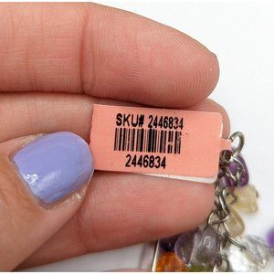 Ammonite Fossil Glass & Gemstone Bead Multicolor Cha Cha Dangle Earrings. The orange beads are glass and the other beads are gemstones. I recognize amethyst and peridot and am not sure about the other gem.
