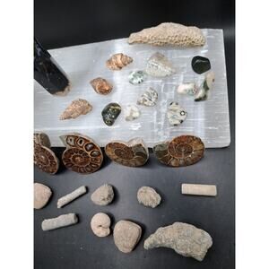 This amazing bundle features a variety of fascinating aquatic fossils and beautiful Ocean Jasper tumbles, plus a striking Palm Tower! You'll receive two Ammonites, one Orthoceras, several Ocean Jasper Tumbles, a celestite cluster, and one Palm Tower. These unique pieces are perfect for collectors, enthusiasts, or anyone who appreciates the natural beauty of the earth and sea. Don't miss out on this opportunity to own a diverse collection of natural treasures!