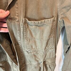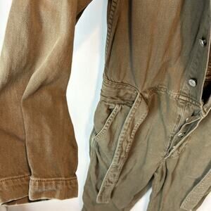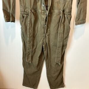 Gently Used AMO Denim Jumpsuit. This is a women's small. Light forest green color throughout. Two side pockets. One chest pocket. Silver AMO buttons. Front tie waist. 82% cotton, 18% rayon. Made in USA.