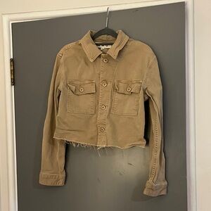 Excellent used condition cropped button down collared chore / utility fall jacket from amo, retails for $228, khaki colorway. Looks great on, somehow so flattering. See pics for measurements. No flaws.