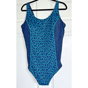 Amoena Manila Full Bodice mastectomy swimsuit in size 26. Features beautiful blue teal leopard print with navy side panels. UPF 50+ protection and LYCRA® XTRA LIFE™ for long lasting wear and shape retention. Hidden pockets in bra cups to hold breast prostheses for post-mastectomy comfort and confidence. Full front and back lining, adjustable straps, and scoop neckline. Perfect for swimming, beach, or pool activities. Professional mastectomy swimwear designed for style and security. Model 71615.
