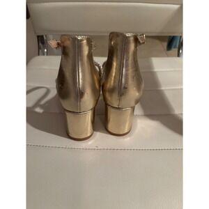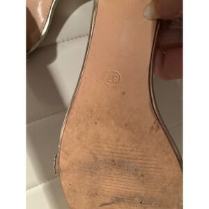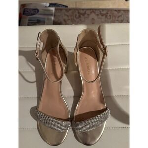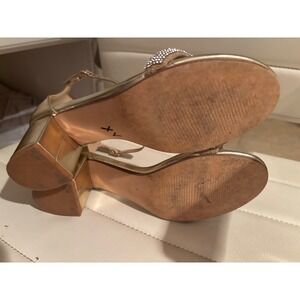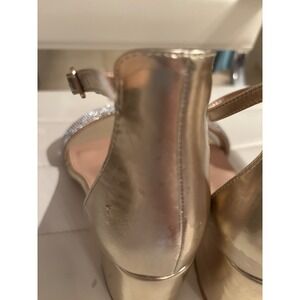 Sparkle and shine with these dazzling Amoji gold sandals. Adorned with a shimmering rhinestone strap across the vamp and a chic block heel, these sandals offer both glamour and comfort. The adjustable ankle strap ensures a secure and personalized fit, making them perfect for dancing the night away or adding a touch of elegance to your everyday look. Ideal for weddings, parties, or a glamorous night out. The heels are peeling but gold underneath. See last two pictures