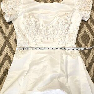 Make a bold and elegant statement on your big day with this breathtaking vintage-style ivory satin wedding gown. Featuring sleek short sleeves and a sophisticated round neckline, this gown blends timeless charm with couture drama. Perfect for the modern bride seeking a classic Look.