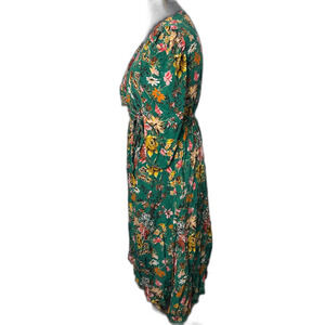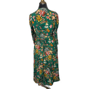 Amour Vert 100% Silk Green Floral Wrap Midi Dress Size M Made in USA Boho Chic