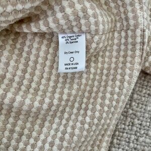 Collarless textured knit jacket/blazer. The style looks structured and chic but the knit material makes it more relaxed. Can be dressed up or down. Oatmeal and cream knit with silver buttons.