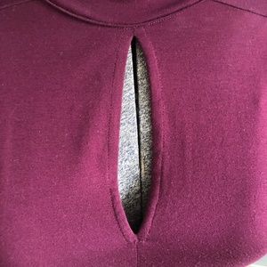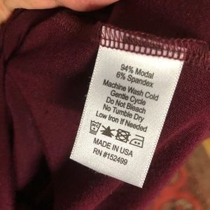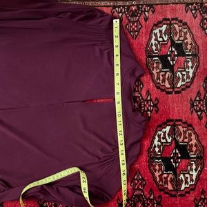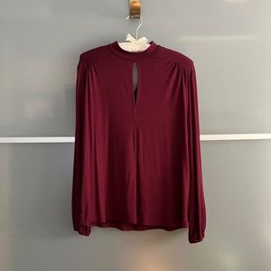 Beautiful and very flattering long-sleeved blouse from sustainable clothing company--Amour Vert. Buttery soft modal/spandex blend fabric in deep burgundy. Keyhole neckline with button at back of neck. Long, blousy sleeves, gathered at cuff. Slight gathering at shoulder front creates an elegant drape. Very good used condition. Some light pilling and a few tiny pulls here and there, visible upon close inspection but not while worn. Smoke-free home.
