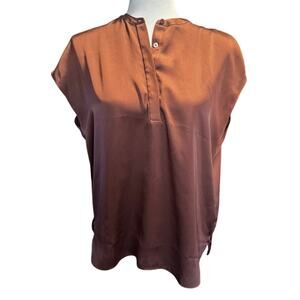 Copper brown blouse from sustainable brand Amour Vert, now closed and highly sought after. short sleeve blouse features a minimalist band collar, soft drape, and lustrous satin finish in an on-trend copper brown shade that complements any wardrobe.