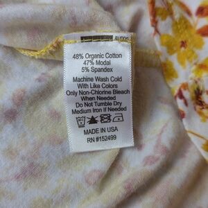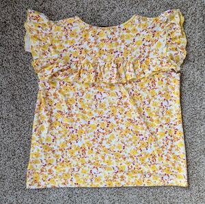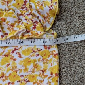This Amour Vert tank top features a vibrant floral pattern in yellow and white, accented with delicate ruffles across the chest and shoulders. The round neckline is adorned with a subtle gathered detail, adding a touch of elegance to its flowy design. Perfect for a sunny day, this top combines style and comfort effortlessly.