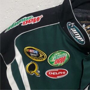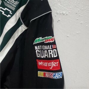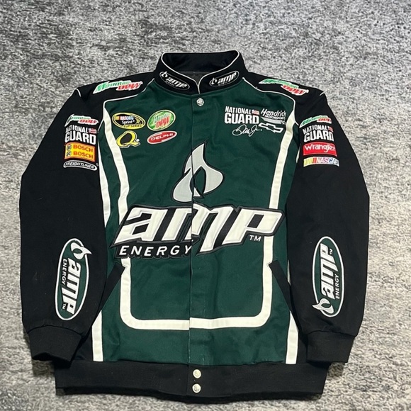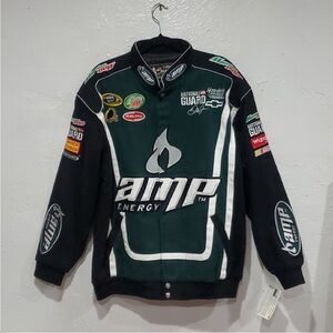 Amp Energy racing jacket with logo patches. Features a green and black color scheme.