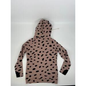 Light brown and black dot printed pullover hoodie. Double lined hood for maximum warmth. Drawstrings are on the side. Front pocket. Small black detailing on the back of the arms.