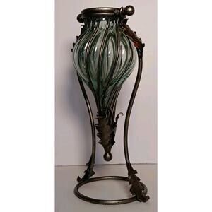 Amphora Vase Hand Blown Caged Green Glass Metal Leaves Stand 14.5"