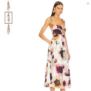 SELF: 100% LINEN.LINING: 100% COTTON. DRY CLEAN ONLY. PARTIALLY LINED. BACK TIE CLOSURE. CONTOUR BUST.ADJUSTABLE SELF TIE SHOULDER STRAPS. SIDE SEAM POCKETS.MIDWEIGHT LINEN FABRIC WITH RUFFLE HEM.