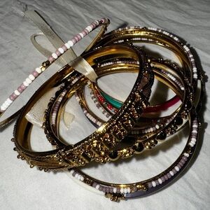 The Monaco Bangle Set includes an 10-piece, mix-and-match set of resin and multi-colored resin beaded bracelets. They measure 8” around and 2 1/2” in diameter. There are 5 Beaded, 3 resin and 2 gold tone.