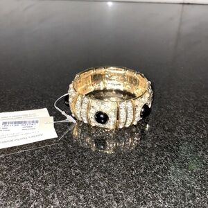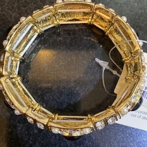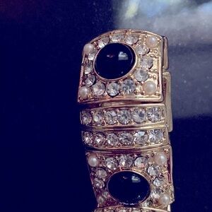 Stunning Amrita Singh Emma Stretch Cuff. Jet black stones, crystals and pearls in a gold brass setting. Stretch to fit. Fits all wrists comfortably. Elegant and classy! Works with day or evening wear.