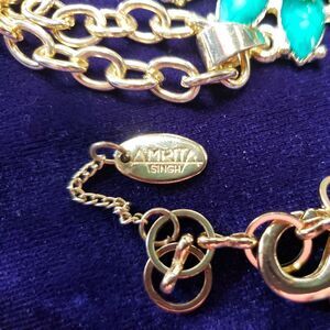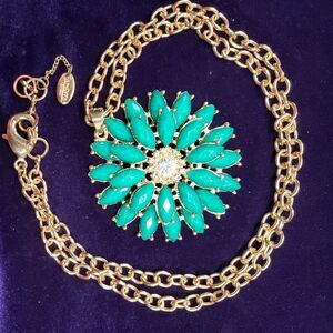 Amrita Singh Signed Necklace, Large Green Flower Medallion Pendant, Gold Tone. Gorgeous Amrita Singh Signed Necklace in Gold Tone Metal with Large 2.5-inch wide Bright Green Colored Flower Pendant. Pendant has lots of green faceted beads as flower petals and brilliant sparkly clear crystals in the center. Hangs on a good size 26-inch-long chain with an additional 1.5-inch extender. Large lobster clasp. Pre-owned but in excellent condition. This is a gorgeous, good quality well-made piece! This is a pre-owned item, and it may have minor wear, but still looks to be in great condition.