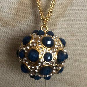 Large lobster clasp closure, double chain strands, gold, large ball pendant covered in clear/white rhinestone and lapis blue-colored faceted stones.