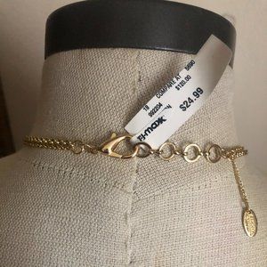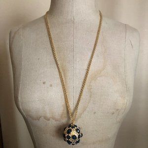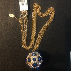 Large lobster clasp closure, double chain strands, gold, large ball pendant covered in clear/white rhinestone and lapis blue-colored faceted stones.