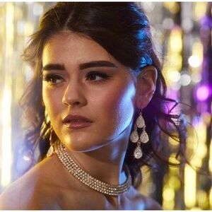 A tiered chandelier evening earring with a teardrop design featuring colored or classic Austrian crystals.