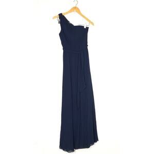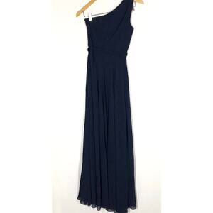 Amsale Athena Bridesmaid Dress One Shoulder Belted Maxi Gown Navy Blue Size 0