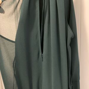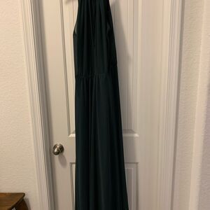Amsale BHLDN formal lined maxi dress. Size: 14. Hidden zipper on back. Chiffon overlay. Thin spaghetti straps. This is a beautiful dress! Thicker lining in the bust area for no bra. Freshly dry-cleaned and ready to go! Worn once. Dark green. Stunning!