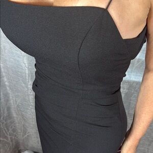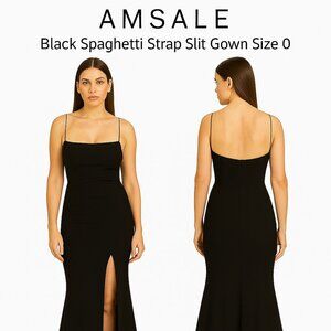 Keywords: Amsale gown, black formal dress, evening gown with slit, spaghetti strap gown, prom dress, gala dress, black tie gown, bridesmaid dress, formal wear size 0, luxury designer dress, wedding guest gown.