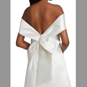 Keywords: off-the-shoulder dress, strapless formal dress, bow back dress, shift silhouette, modern formal gown, minimalist formalwear, cocktail dress, rehearsal dinner dress, wedding dress, bridal shower dress, engagement party outfit, ivory dress, white cocktail dress, mikado satin, pre-loved designer dress, worn once, designer resale, dress with pockets, crisp white formal, old money, timeless dress, elegant bow detail
