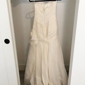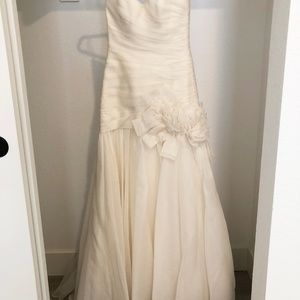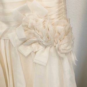 Strapless, silk organza gown with a sweetheart neckline and asymmetrically ruched bodice with floral detail at hip. Ivory color. Original retail price: $4200. Worn once and was professionally dry cleaned. Label size: 2; Street size: 2. Hem altered. I'm 5'3" and wore 4" heels. Price is firm.