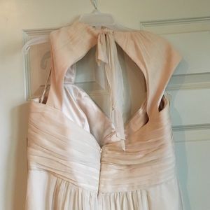 Amsale bridesmaid dress in vanilla. Style G764C in crinkle chiffon. Beautiful Juliette back. This is in a size 20, but has been taken in and is much more like a size 18. It has also been hemmed to be the right length for me at 5'5" in flats.